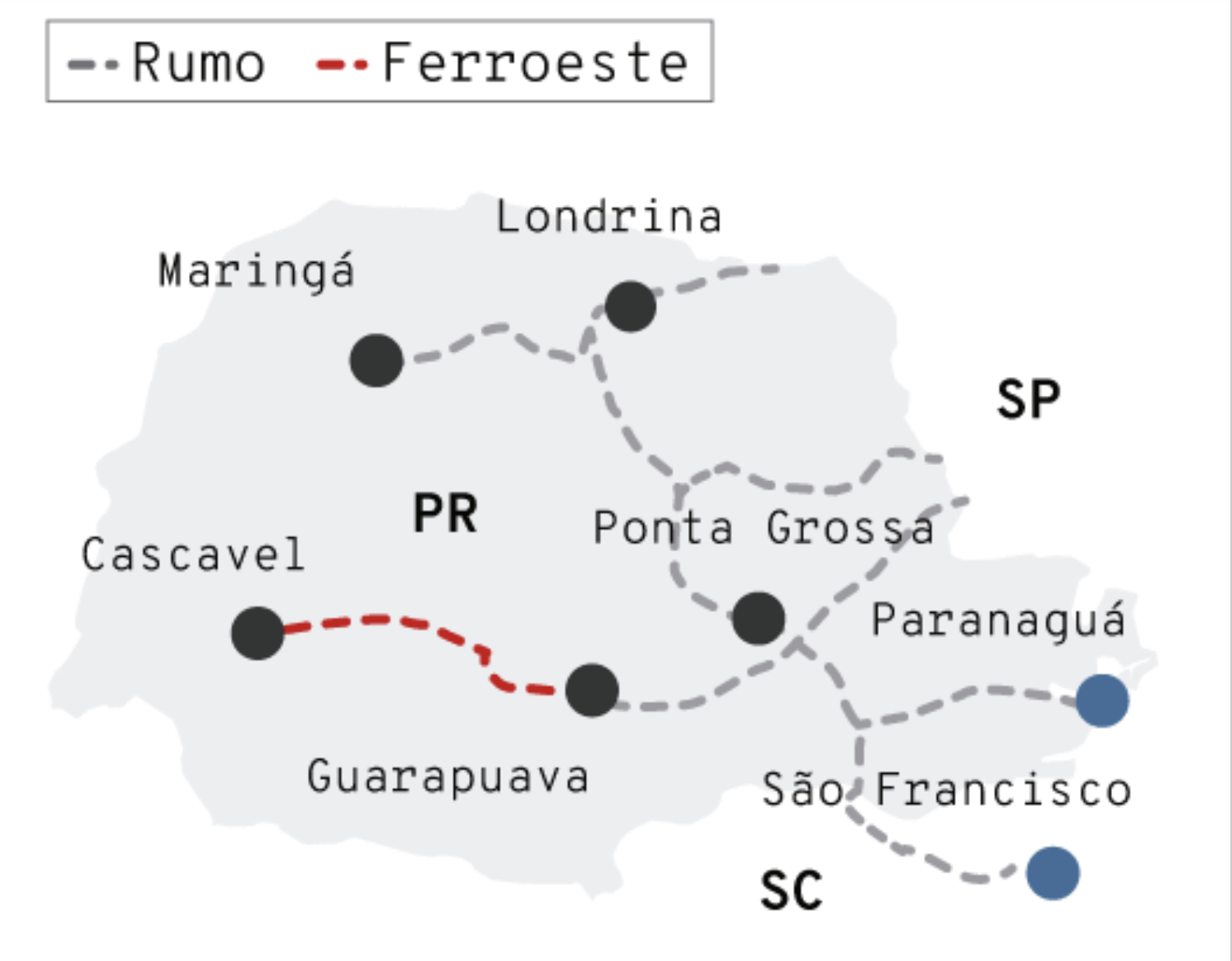 O interesse em reativar e retificar os trechos antigos é zero. Pelo contrário: o governo trabalha para extinguir o ramal para Rio Branco do Sul. O tráfego resume-se aos corredores de exportação Cascavel-Paranaguá e Londrina-Paranaguá.