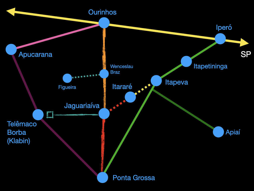 O croqui abaixo mostra a linha-tronco da Sorocabana e alguns ramais da RVPSC em território paranaense que direta ou indiretamente emergem da EFS.