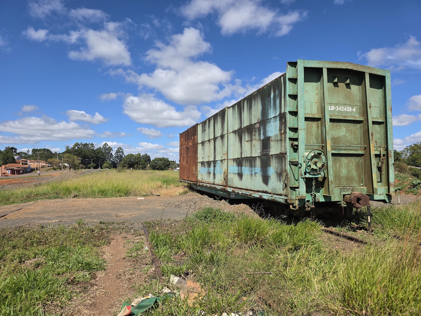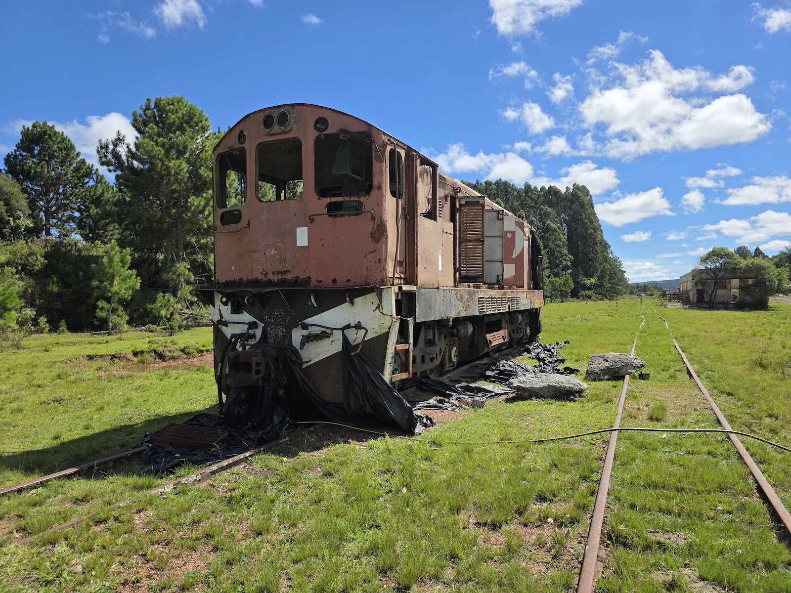 Nessa estação ficou abandonada uma locomotiva GL8, a 4015, que provavelmente foi ficando para manobrar as centenas de vagões abandonados ao longo da ferrovia, até restar isolada e depredada. E pensar que há inúmeros vídeos no YouTube mostrando a 4015 trabalhando, em RS, SC, PR e SP.