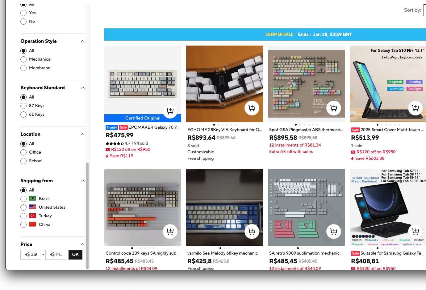 Para achar os keycaps que chegam perto da qualidade da Signature Plastics, é preciso filtrar por preço mínimo, do contrário os anúncios mais baratos inundam sua procura.