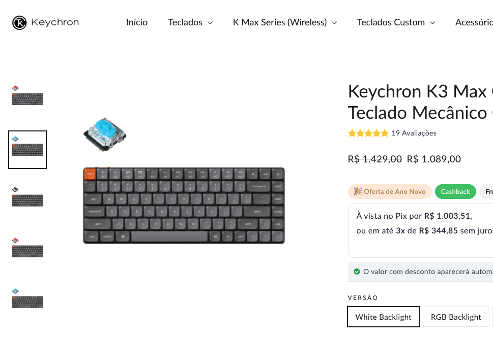 Para polemizar ainda mais, optei pelas chaves "azuis" (barulhentas), que tinham causado um problema adicional no EK820 — ponto de contato inconsistente com o clique. Mas decerto um teclado do preço do Keychron não repetiria o defeito.