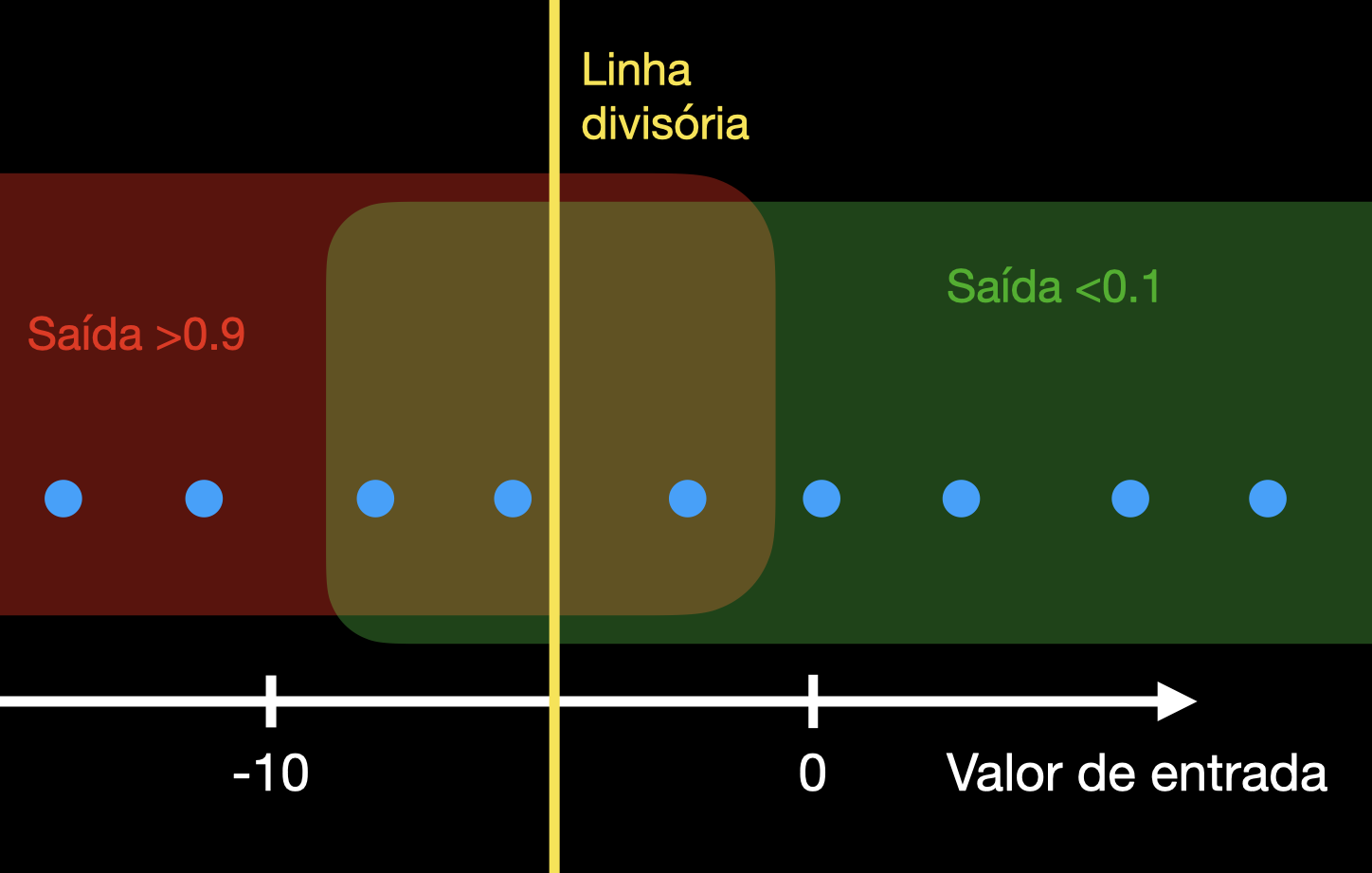 O modelo que produzimos acima fornece respostas inequívocas para números maiores que 0 ou menores que -10. Para entradas entre -10 e 0, a saída será uma resposta "nem sim nem não", maior que 0.1 e menor que 0.9. Neste caso, isto foi de propósito.