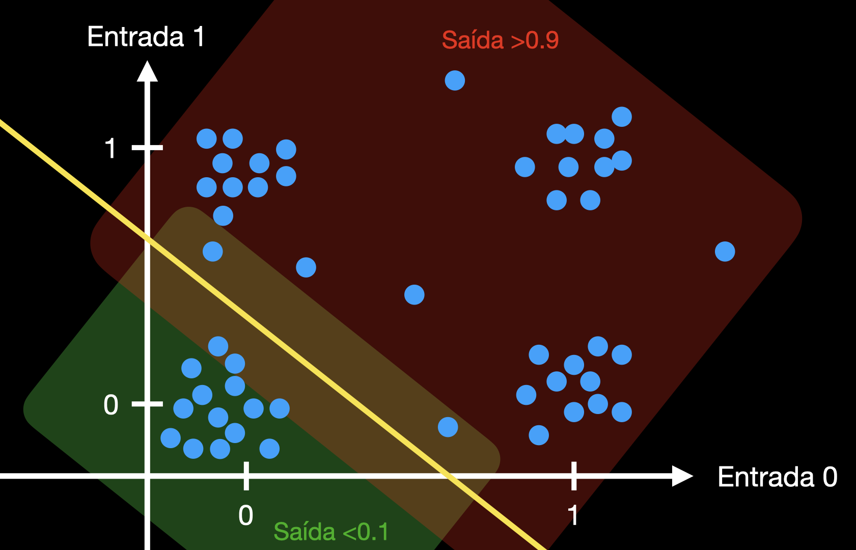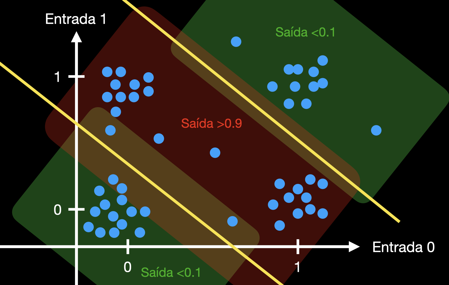 Este é um exemplo elementar de função que não é linearmente separável. Não existe uma correlação linear válida entre as entradas e a saída. Para separar graficamente as amostras com saídas "baixas" daquelas com saídas "altas", precisamos de dois cortes.