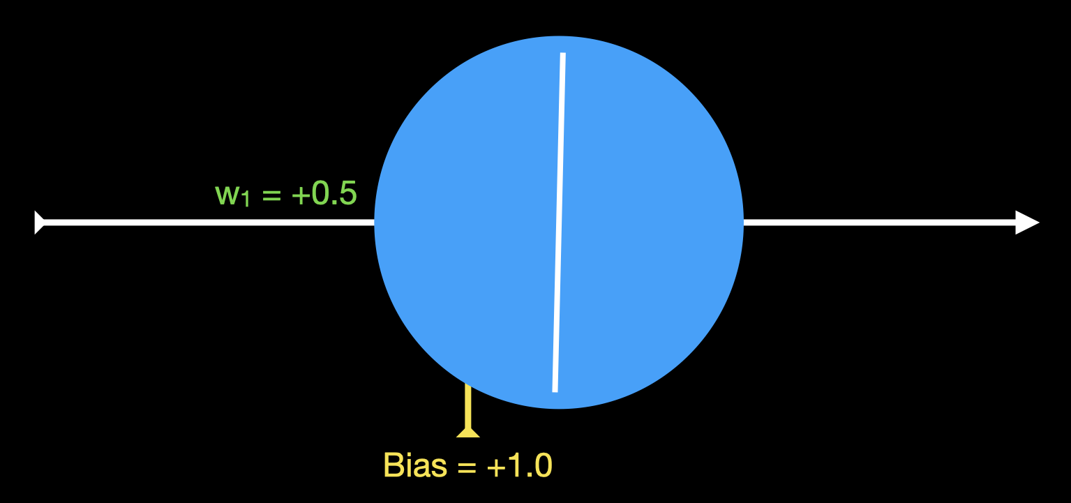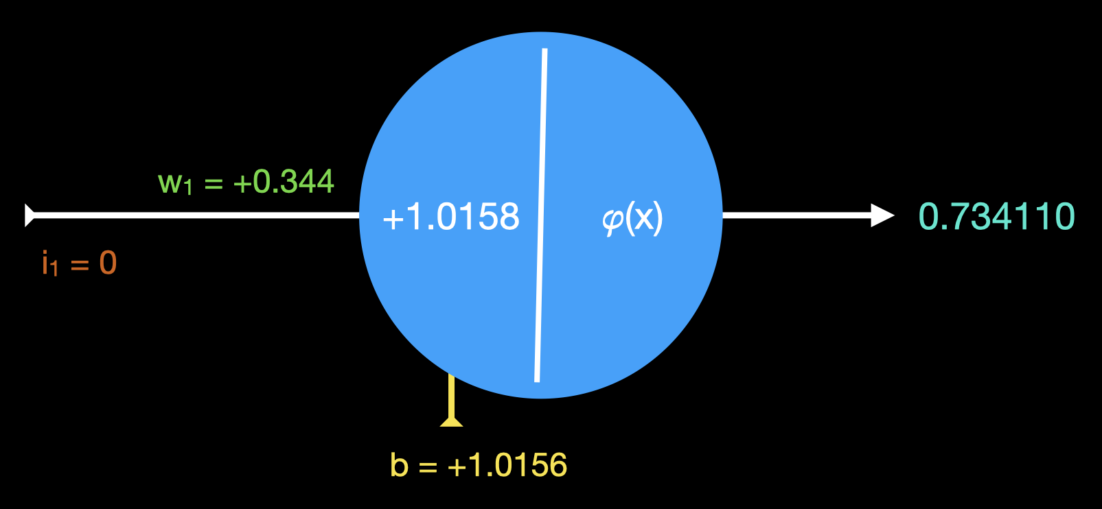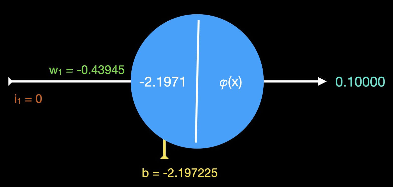 O peso inicial w1 começa igual a +0.5, enquanto o bias B começa em +1.0. Mas poderia começar com outros valores. Em geral, os pesos são iniciados com valores aleatórios pequenos.