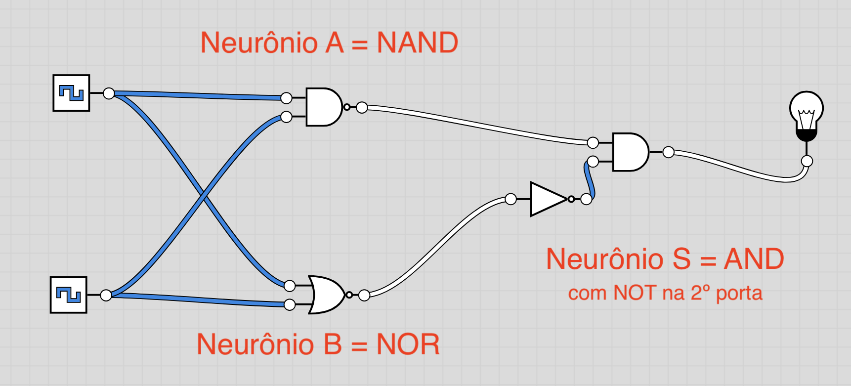 O circuito lógico acima é equivalente ao modelo da figura anterior. Os neurônios A e B implementam portas lógicas NAND e NOR. O neurônio S implementa uma porta lógica AND com um inversor na entrada vinda da porta NOR.