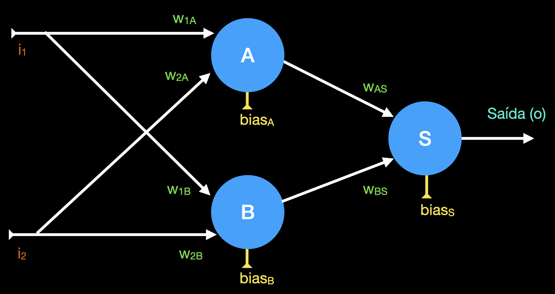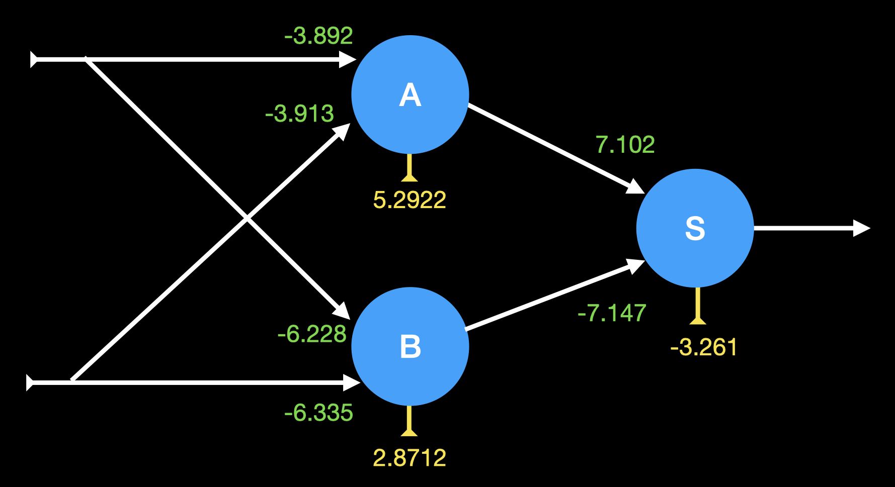 Também é importante lembrar que, se os pesos e biases iniciais forem aleatórios, cada sessão de treinamento pode realizar um circuito lógico equivalente porém diferente da figura acima. Nos meus testes, observei o aparecimento esporádico de pelo menos uma variante, com portas lógicas A=AND, B=OR e S=OR, todas com inversor na segunda entrada.